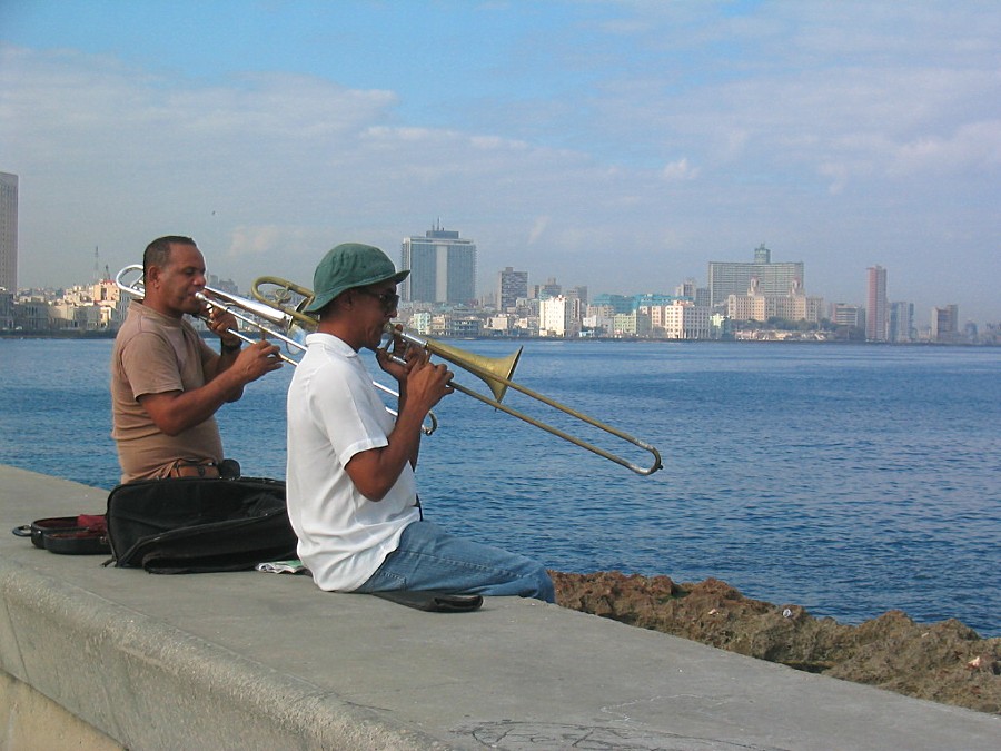 La Havane, musiciens de rue - en arrière plan le quartier de Vedado